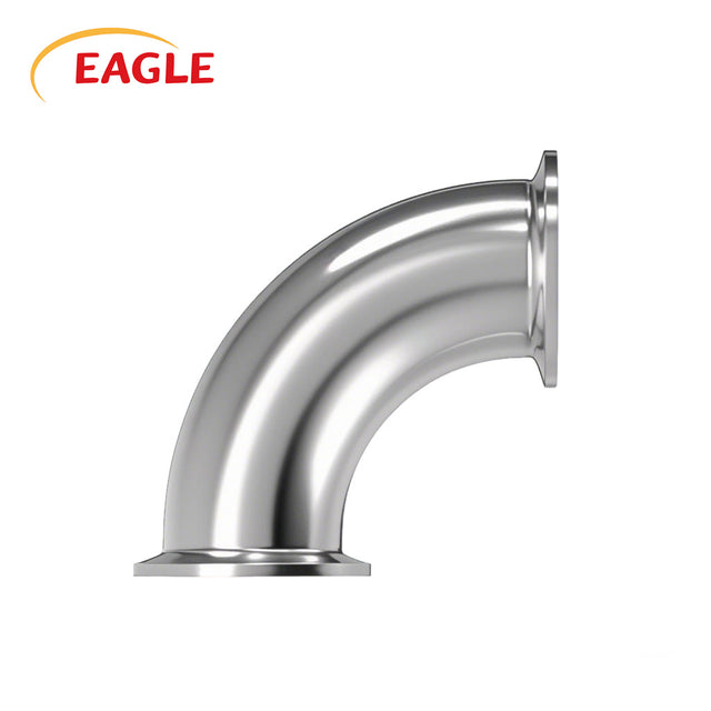 Sanitary 90 Deg Clamp Elbow is available in both 304 and 316L alloy, stainless steel. Clamp adapters such as the single pin heavy duty clamp with wing nut or bolted clamp should be used to properly secure joining ends.